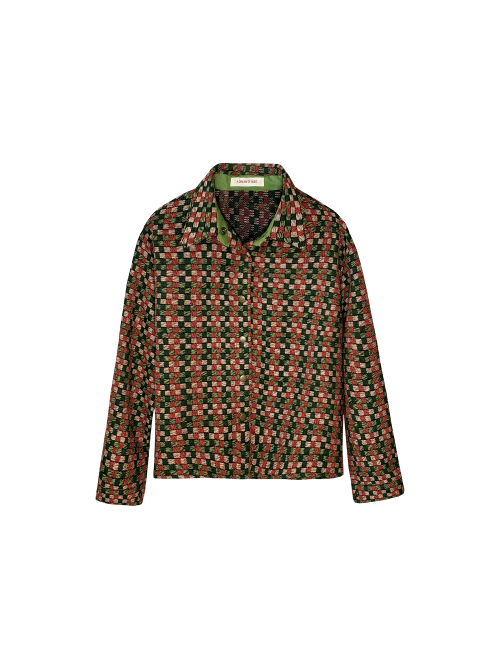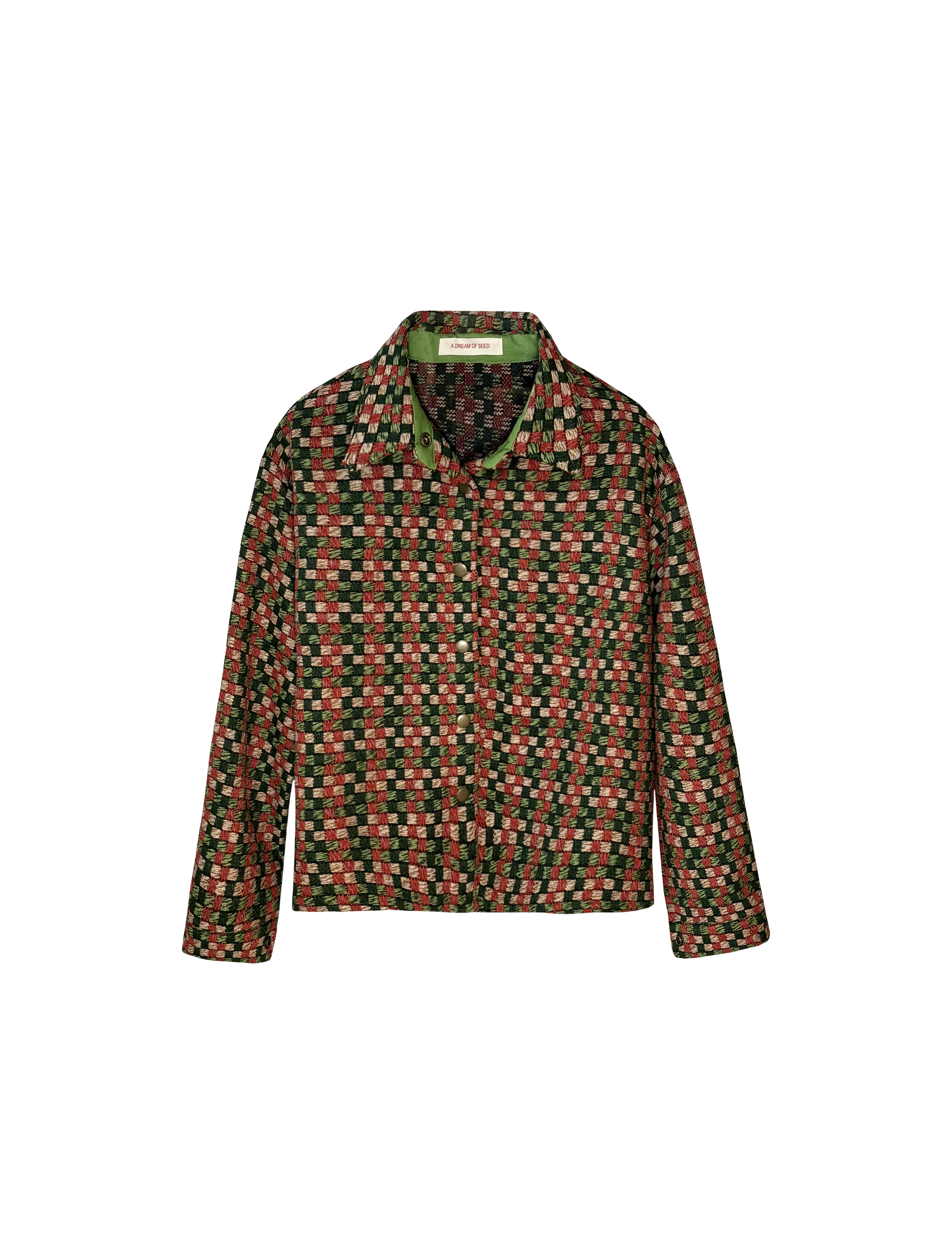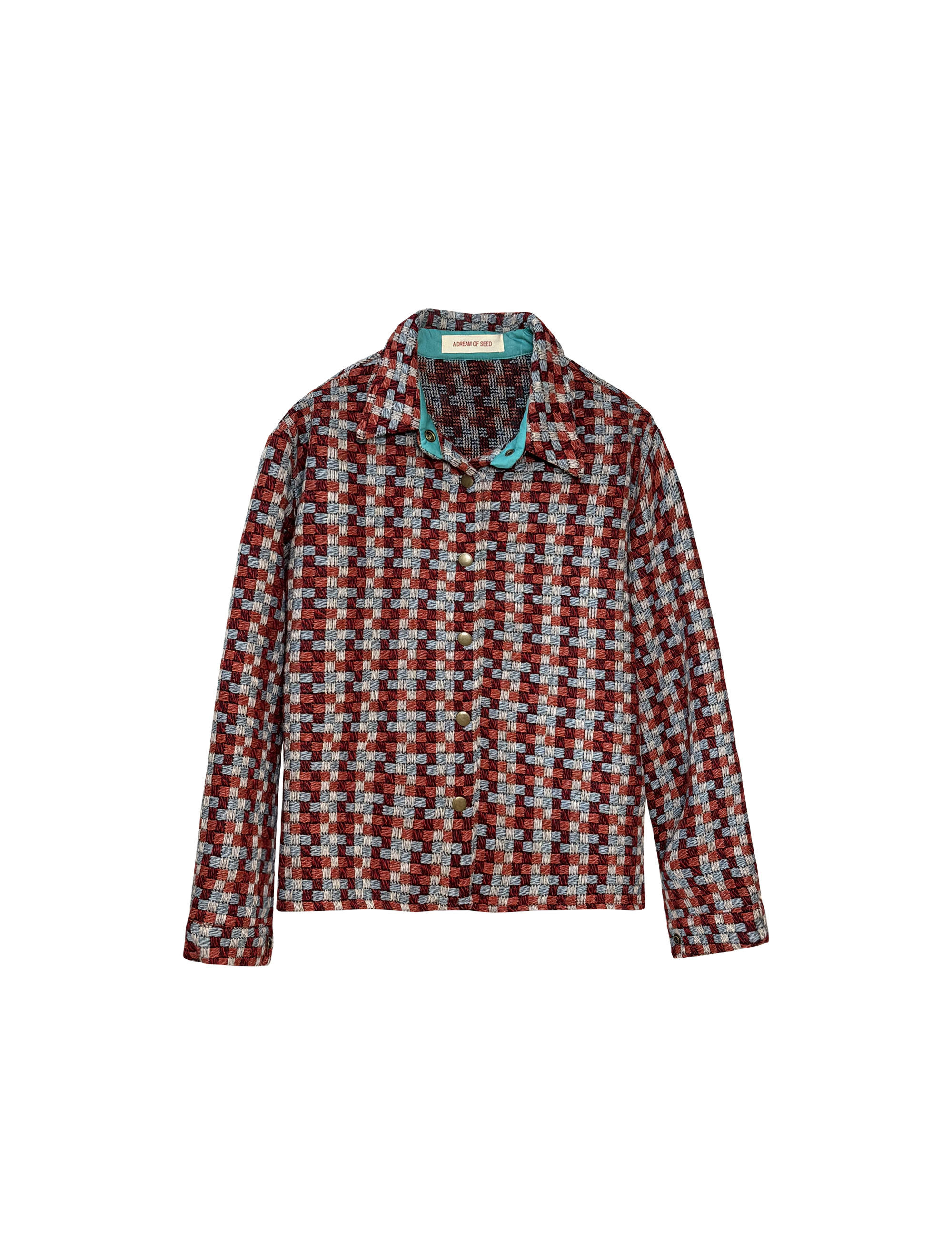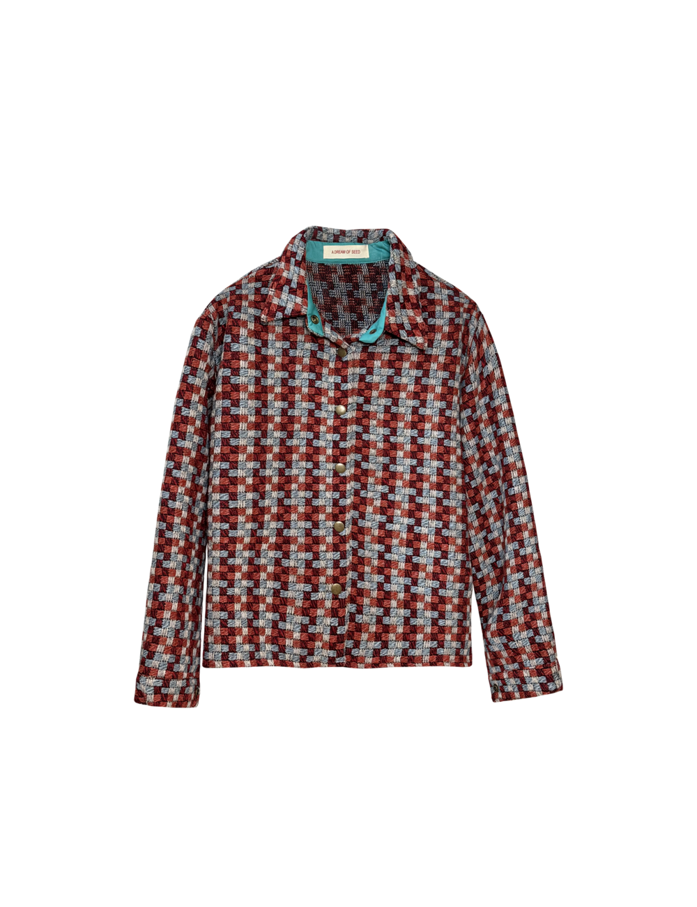 독특한 컬러 조합의 체크 패턴이 돋보이는 자켓으로,카라 안쪽의